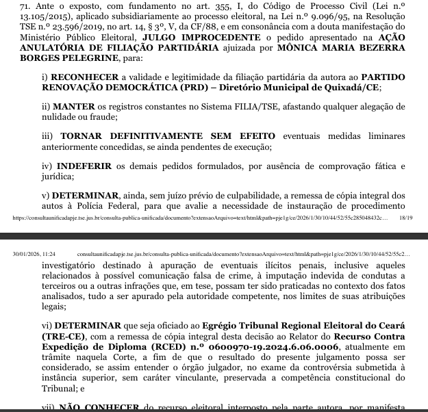 Na decisão, o Juiz Eleitoral da 6ª Zona, Dr Welithon Alves de Mesquita, disse que “O conjunto probatório produzido nos autos revela, de forma segura e convergente, que: a. Houve filiação válida, consciente e voluntária da autora ao Partido da Renovação Democrática – PRD de Quixadá/CE; b. não se comprovou a existência de fraude, coação ou vício de consentimento apto a macular o ato de filiação; c. os registros no FILIA/TSE refletem a realidade jurídica dos fatos, estando em consonância com as provas técnicas produzidas.”